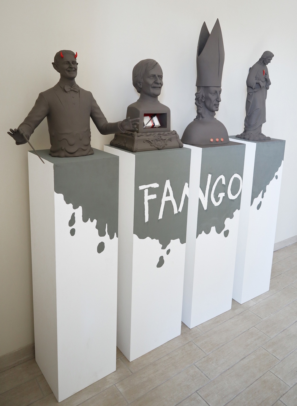 L’installazione è composta da quattro ritratti degli Squallor in terracotta monocroma. Totò Savio è un direttore d’orchestra nelle sembianze di un allegro diavolo, com’era nella realtà, gentile ma con un grande senso ironico che si esprimeva nelle canzoni più iconiche e dissacranti della band. Un busto reliquario con il volto di Giancarlo Bigazzi accoglie al suo interno un pacchetto di sigarette e una penna a sfera, vizi e virtù del grande autore della musica italiana. Alfredo Cerruti è modellato nei panni di papa Gennarino primo, personaggio di uno dei suoi più famosi monologhi. Daniele Pace è ritratto come un gesù superstizioso che rimanda al personaggio da lui interpretato nel film “Uccelli d’Italia”, con un cornicello portafortuna al posto del cuore, a ricordare la sua ossessiva superstizione.