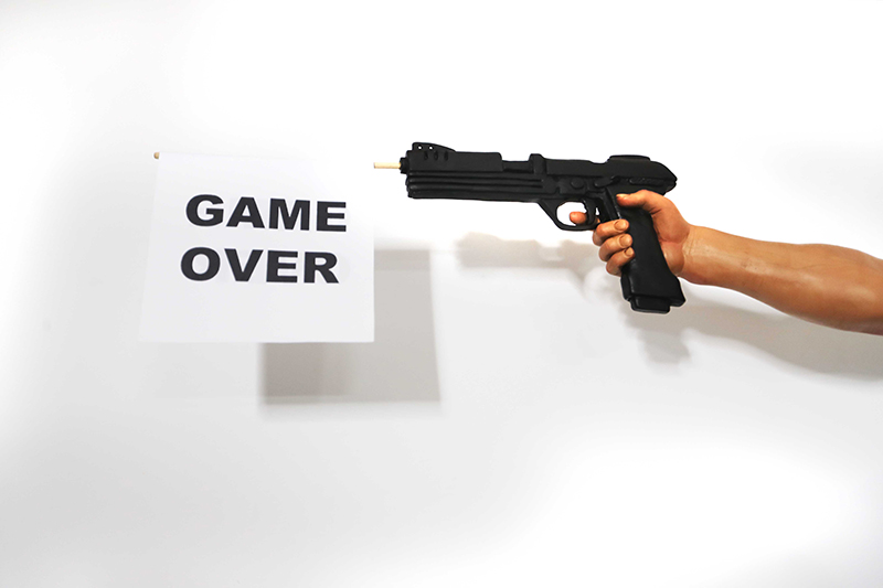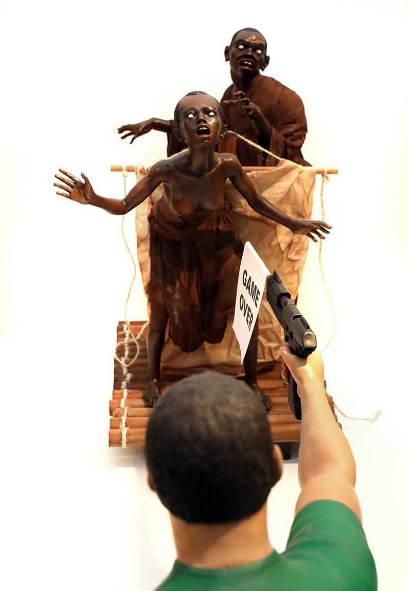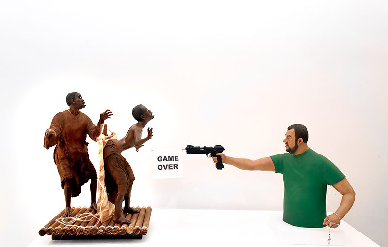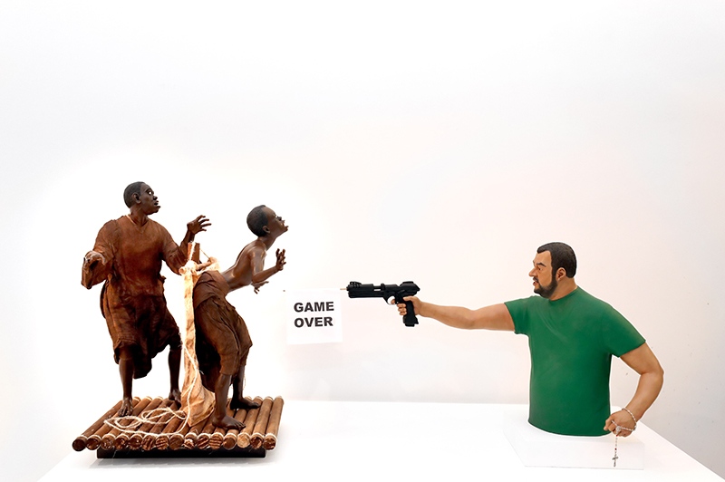 L’opera rappresenta l’ex ministro dell’interno in maglia verde con il numero 49, che punta una pistola giocattolo, dalla quale fuoriesce una bandierina con la scritta “game over”, su una coppia di zombie “di colore”, naufraghi su una piccola zattera. La scena vuole rappresentare un “video game” nel quale l’ex ministro degli interni è un giocatore accanito che simula l’ossessiva battaglia contro i migranti, percepiti da lui e