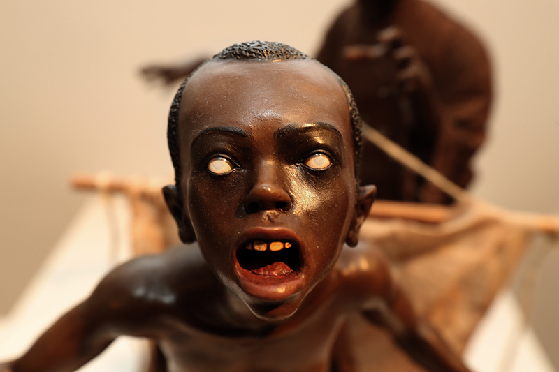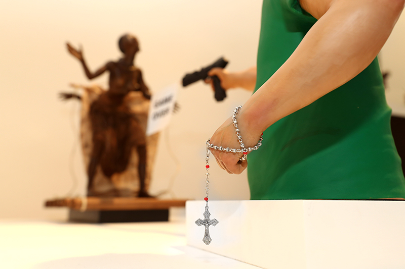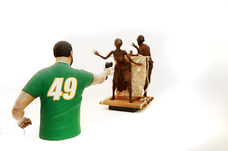 Lo ricorda il rosario che la statua impugna nella mano sinistra, simbolo religioso che lo stesso Salvini esibisce frequentemente nelle sue uscite pubbliche. L’associazione tra la politica e il gioco è la metafora dell’opera. La violenza verbale del populismo associato al sovranismo razziale, diventano strumenti pericolosi quando un politico porta il confronto allo scontro continuo, riducendo il tutto ad un gioco da vincere, solleticando l’odio della massa contro un nemico da abbattere, magari indifeso, soprattutto debole.